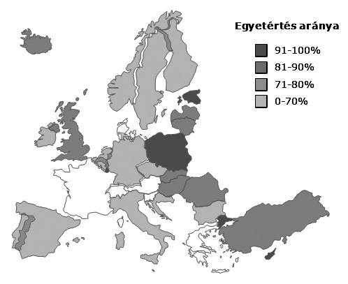 A „Növeli-e a tudomány a következő generációk életminőségét?” kérdésre adott egyetértő válaszok aránya Európa egyes országaiban