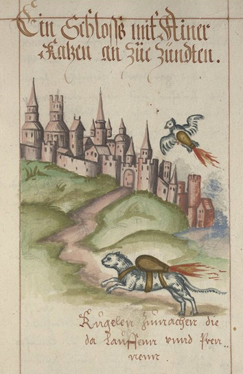 A madárbomba mellett a macskabomba volt még a korszak egyik nagy tüzérségi újítása. Illusztráció 1584-ből ismeretlen szerző kéziratos könyvéből (Feuer Buech, durch Eurem gelertten Kriegs verstenndigen mit grossem Vleis auss villen Probiertten Kunsten …)