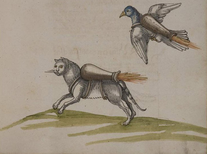 Kirívó eset a vikingekkel kapcsolatban már említett ‘madárbomba’ felhasználása. Úgy tűnik ugyanis, hogy a galambok hazarepülő szokása a késő középkorban is előhozta ezt az ostromeszközt, ezúttal német földön. Egy 1420-as berlini tüzérségi kódex említi ezt a módszert, illetve illusztrálta is. Ennek folyományaként 1530 tájáról és 1584-ből is találunk hasonló leírásokat illusztrációkkal tüzérségi munkákban. A későbbi kódexek egyértelműen felhasználták az 1420-ast, de bővítettek is rajta, így valószínűleg a gyakorlatban (vagy legalább elméleti szinten) túlléptek az ősön, illetve próbálkoztak annak megvalósításával.36 A városok közelében keresgélő galambokat befogva és gyújtóbombával ellátva próbálták az ostromlók felgyújtani a várost (remélve, hogy eredetileg a falak között költő galambokat szereltek fel a bombákkal).
