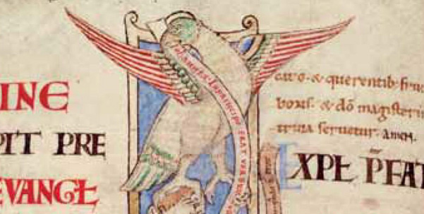 János evangéliumának kezdete. Szt. Stephen Harding Bibliája. Citeaux, 1109. fol. 56v. Bibliothèque Municipale, Dijon. (A kódex illusztrátora minden valószínűség szerint egy postagalambbal kívánta szemléltetni az örömhír érkezését. Ld. Holcomb, 2009. 80.)
