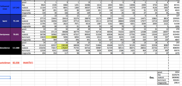 - A gyűjtés a 2017. január 1-től 2018. január 1-ig tartó intervallumba eső aktivitásokat foglalta magába, amibe minden oldal esetén beletartozik egy éves aktivitási eloszlás, egy országos eloszlása az adott oldalt kedvelőknek, egy a posztokhoz tartozó statisztikai és a kommenteket, valamint azok adatait összefoglaló táblázat, illetve egy Gephi fájl. Ez utóbbit leszámítva minden adatot Microsoft Excel-ben lehetett olvasni, rendezni stb.↩
