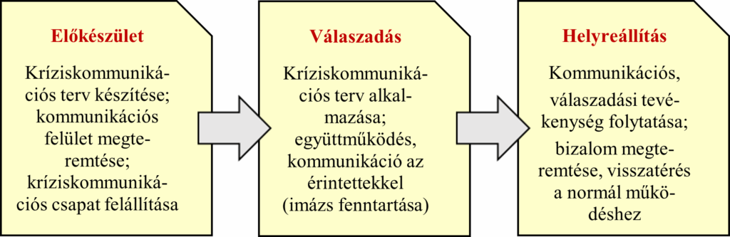 | AZ SCCT VÁLSÁGKEZELÉSI FOLYAMAT HÁRMAS FELOSZTÁSA | Válság előtt: jelek detektálása, preventív lépések, felkészülés Válság: kiváltó esemény felismerése és megfelelő válasz kialakítása Válság után: a „normál” ügymenetet érintő tevékenységek, mint az utánkövetés, részvétel vizsgálatokban és a tanulási folyamat | Az egyik legelterjedtebb modell. (Coombs 2007) |