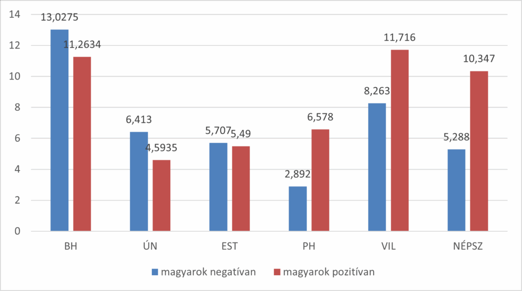 A pozitív és a negatív értékeléseket a magyar csoport esetében napilaponként a korpusz szószámához viszonyítva, százalékos arányban is vizsgáltam. Az eredményeket az 1. diagram mutatja. A magyarok csoportjába tehát nemcsak az egész nemzetet jelölő szavakat válogattam be a szógyakoriság vizsgálat során, hanem az elemzésben megjelölt politikai csoportokat, szervezeteket, pártokat és politikusokat is. A csoportközi értékelés eredményei tehát a magyar csoportra összességében és a magyar csoport részét képező kisebb csoportok egészére vonatkoznak napilaponként.