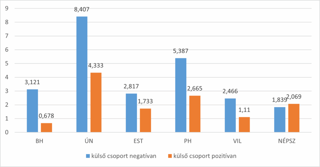 A saját csoport pozitív és negatív értékelései, az értékelés tárgya: külső csoport