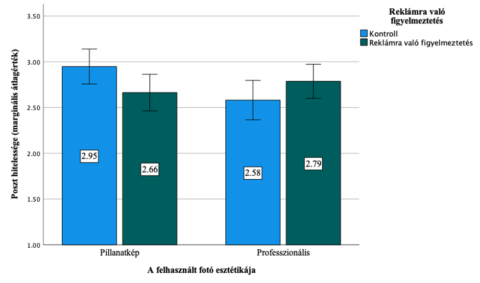 Hipotéziseinket két szempontos varianciaanalízissel teszteltük. Az első modellben a független változók a reklámra való figyelmeztetés és a felhasznált fotó esztétikája voltak, a függő változó a poszt hitelessége, a márkaismertség pedig a kovariáns. Az eredmények szerint szignifikáns interakció van a reklámra való figyelmeztetés és a fotó esztétikája között (F(1, 302) = 5,94, p = 0,015 p2 = 0,019). Az eredményeket az 1. ábra illusztrálja. Ahogy az ábrán is látható, a pillanatképszerű fotó használatakor a reklámra való figyelmeztetés negatív hatás gyakorol a poszt hitelességének megítélésére (átlagok közti különbség = 0,285, p = 0,043), míg a professzionális fotó esetében nincs különbség a kontroll poszt és a reklámra való figyelmeztetést tartalmazó poszt között (átlagok közti különbség = -0,205, p = 0,115). Továbbá amennyiben nincs reklámra való figyelmeztetés, a pillanatképszerű poszt hitelessége szignifikánsan nagyobb, mint a professzionális poszté (átlagok közti különbség = 0,367, p = 0,013). Viszont amennyiben a poszt tartalmaz reklámra való figyelmeztetést, nincs különbség a pillanatképszerű és professzionális képet tartalmazó posztok között (átlagok közti különbség = -0,123, p = 0,378).