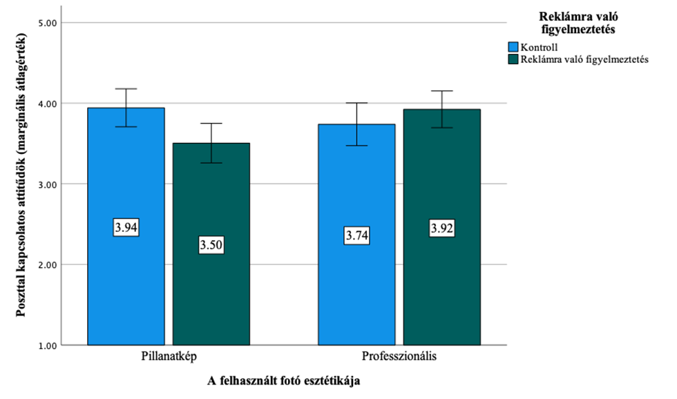 A második modellben ugyanazokat a független változókat (reklámra való figyelmeztetés és a felhasznált fotó esztétikája), illetve ugyanazt a kovariánst (márkaismertség) használtuk, viszont a függő változó a poszttal kapcsolatos attitűd volt. Az eredmények ismételten szignifikáns interakciót jeleztek a két független változó között (F(1, 302) = 6,36, p = 0,012, p2 = 0,021). Az eredményeket a 2. ábra foglalja össze. Az eredmények hasonló mintázatot mutatnak, mint a poszt hitelességének esetében. Amennyiben a posztban pillanatképszerű fotó szerepel, a reklámra való figyelmeztetés hatása negatívabb poszttal kapcsolatos attitűdöket eredményez (átlagok közti különbség = 0,438, p = 0,012), míg a professzionális poszt esetében nincs szignifikáns különbség a kontroll és a reklámra való figyelmeztetést tartalmazó poszt esetében (átlagok közti különbség = -0,185, p = 0,296). Továbbá amennyiben megjelenik a reklámra való figyelmeztetés a posztban, a professzionális poszttal kapcsolatos attitűdök pozitívabbak, mint a pillanatképszerű fotót használó poszttal kapcsolatos attitűdök (átlagok közti különbség = -0,419, p = 0,015). A kontrollposztok között viszont nincs szignifikáns különbség (átlagok közti különbség = 0,204, p = 0,258).