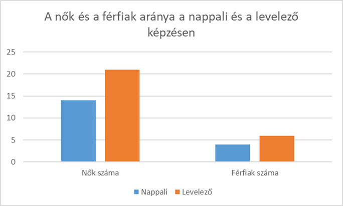 A kérdőíveket összesen 45 hallgató töltötte ki: 18 nappali (40%) és 27 levelező (60%) tagozaton tanul, ezen belül a nappali képzésről 14 nő (78%) és 4 férfi (22%), a levelezőnél pedig 21 nő (78%) és 6 férfi (22%). A kitöltések alapján látható (1. diagram, 2. diagram), hogy a kommunikáció- és médiatudomány képzést nagyobb részben nők választják (összesen 35 nő és 10 férfi, 78% és 22%). Ezekből a számokból végső következtetést azonban nem vonhatunk le, hiszen írástechnika-kurzusból több csoport is indul az évfolyamon.
