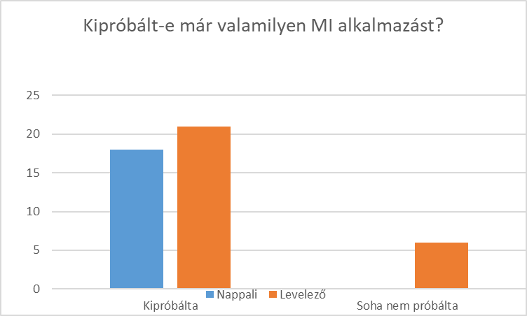 A kérdőív további kérdései során kifejezetten a mesterséges intelligencia ismeretére és használatára helyeztem a hangsúlyt (5. diagram). Az ismeretre vonatkozó kérdés esetében a megkérdezett 45 hallgató mindegyike azt válaszolta, hogy hallott már az MI-ről, és csupán 6 (13%) olyan hallgató akadt, aki egyáltalán nem próbálta még ki soha egyik alkalmazását sem. Ezen hallgatók mindegyike levelező tagozatos.